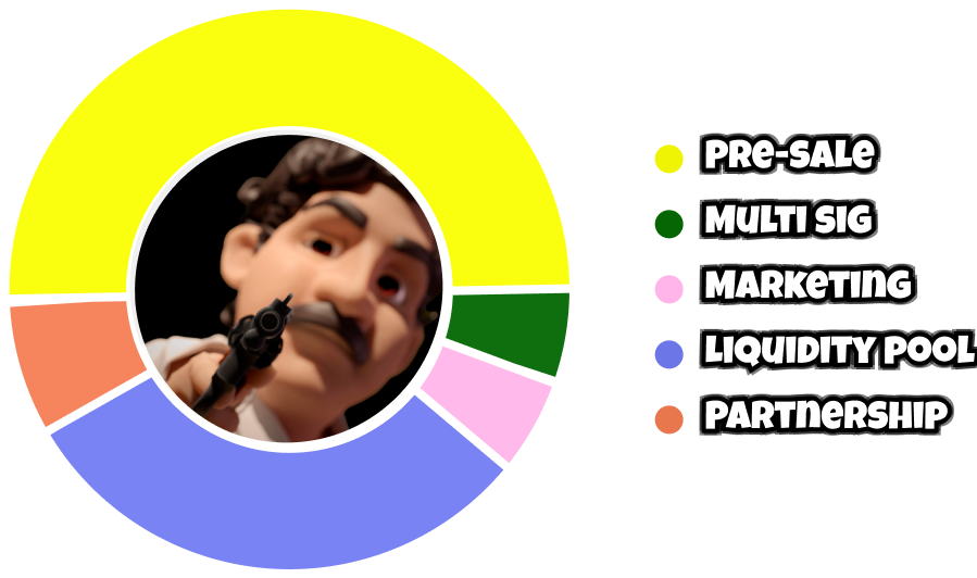 In $Pablo’s world, a unique ecosystem unfolds where Crypto Pablo associates enjoy tax-free transactions when acquiring $PABLO products. The tax rate, ranging from 0% to a maximum of 10%, is determined by Pablo’s mood and the protocol’s profitability for the cartel. Those deemed traitors, diverting profits to rival turfs, face the higher end of this spectrum. A percentage of tokens is allocated to presale and liquidity pools, with 5% reserved in a MULTI SIG wallet for future centralized exchange listings. Another 5% is set aside for the development team, subject to a 180-day lock. The remaining tokens find their way to bridges and liquidity pools, ensuring transparency in the allocation process. This financial underworld operates seamlessly, guided by the whims of $Pablo and the prosperity of the cartel.